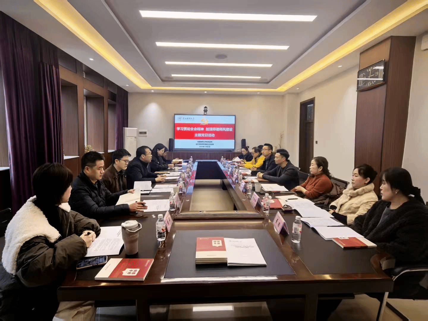 2025-12-0812月3日下午,党委教师工作部党支部与音乐学院声乐系教工党支部以“学习贯彻全会精神 加强师德师风建设”为主题,开展联学共建主题党日活动。音乐学院党委书记范玮熠从党建与业务双融双促、机关与学院协同发展等方面介绍了支部共建的背景。党委教师工作部党支部书记、部长曲洪刚结合党的二十届四中全会对高校教师队伍建设提出的新要求,解读了《陕西师范大学教师师德师风负面清单实施细则》的主要内容和具体要求。音乐学院声乐系教工党支部书记任红星领学了《...