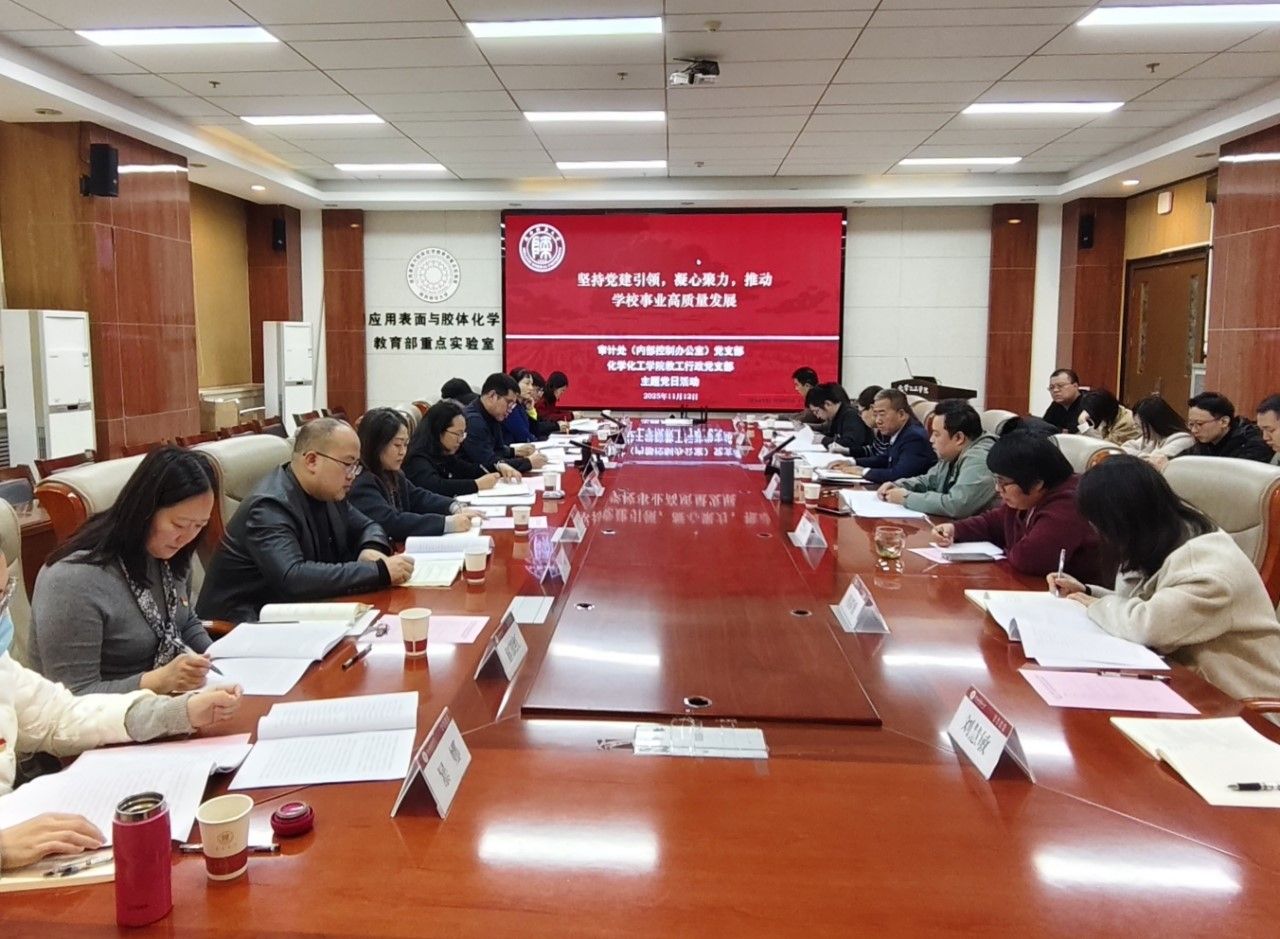 11月12日上午,机关党委审计处(内部控制办公室)党支部与化学化工学院教工行政党支部在致知楼1568会议室联合开展了以“坚持党建引领,凝心聚力,服务学校事业高质量发展”为主题的支部结对共建党日活动。会议由化学化工学院党委委员、行政副院长肖新军主持。