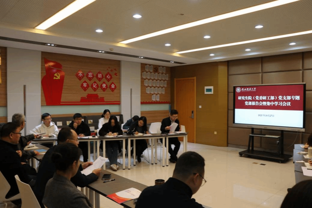 10月27日上午,研究生院(党委研工部)党支部在文汇楼A段503党员活动室召开学习贯彻党的二十届四中全会精神专题辅导报告会暨党员大会,会议邀请国际商学院姚宇教授作辅导报告。支部书记贾颍辉主持会议。